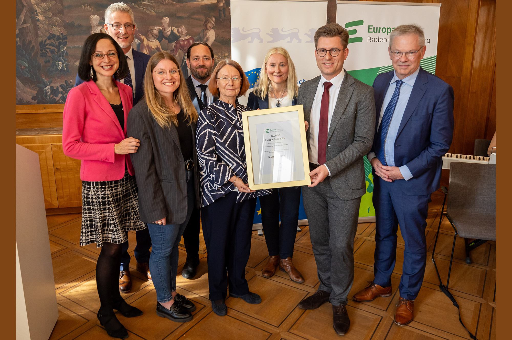Passend zum Europatag hat die Stadt Gerlingen am 9. Mai 2025 in der Villa Reitzenstein von der Europa-Union Baden-Württemberg und der Europäischen Bewegung Baden-Württemberg in Zusammenarbeit mit den kommunalen Landesverbänden, Städtetag, Gemeindetag und Landkreistag den Europapreis verliehen bekommen.