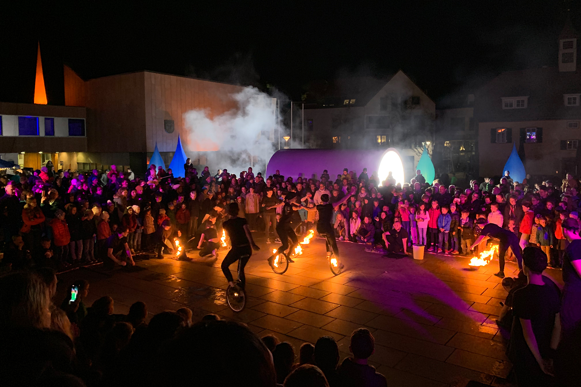 Um 19.00 Uhr startete an der Stadtbücherei der Schaufenster-Art-Walk: Mit Bürgermeister Dirk Oestringer ging es auf einen Rundgang zu Ladengeschäften, die in ihren Schaufenstern Werke von Gerlinger KünstlerInnen zeigten. Eine Feuerjonglage der Jonglier-AG des Robert-Bosch-Gymnasiums gab es um 19.30 Uhr auf dem Rathausplatz zu sehen.